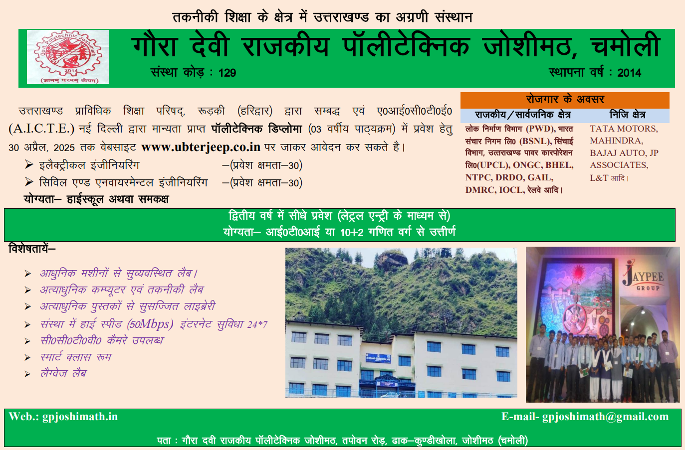 GOVT. POLYTECHNIC JOSHIMATH, CHAMOLI was established by Government of Uttarakhand in 2014 for Diploma course in ELECTRICAL ENGINEERING. Keeping in view the vast progress in the field of industrialization in this state, Polytechnics have to redefine themselves and come with shoulder to shoulder status with the industries. We are trying to develop human resource with same pace as industrial growth is going on. The Institute is situated at Joshimath (Chamoli). Govt. Polytechnic, Joshimath (Chamoli) is approved by AICTE and Affiliated to Uttarakhand Board of Technical Education Roorkee (UBTER). Our aim is not only to pursue academic excellent but also motivate and empower the talent skills and ability to each student need to be identified and encouraged so that our student is able to reach at great heights. Our unique supportive system will provide access to academic mentoring career counseling hand on experience at organization. Govt. Polytechnic, Joshimath (Chamoli) campus provides unparalled opportunity for students. A wealth of resources and support services help students get the most out of their time at Govt. Polytechnic, Joshimath (Chamoli). From well equipped libraries to innovative Workshop and Laboratory, students have access to many tools to explore academic and practical interests.